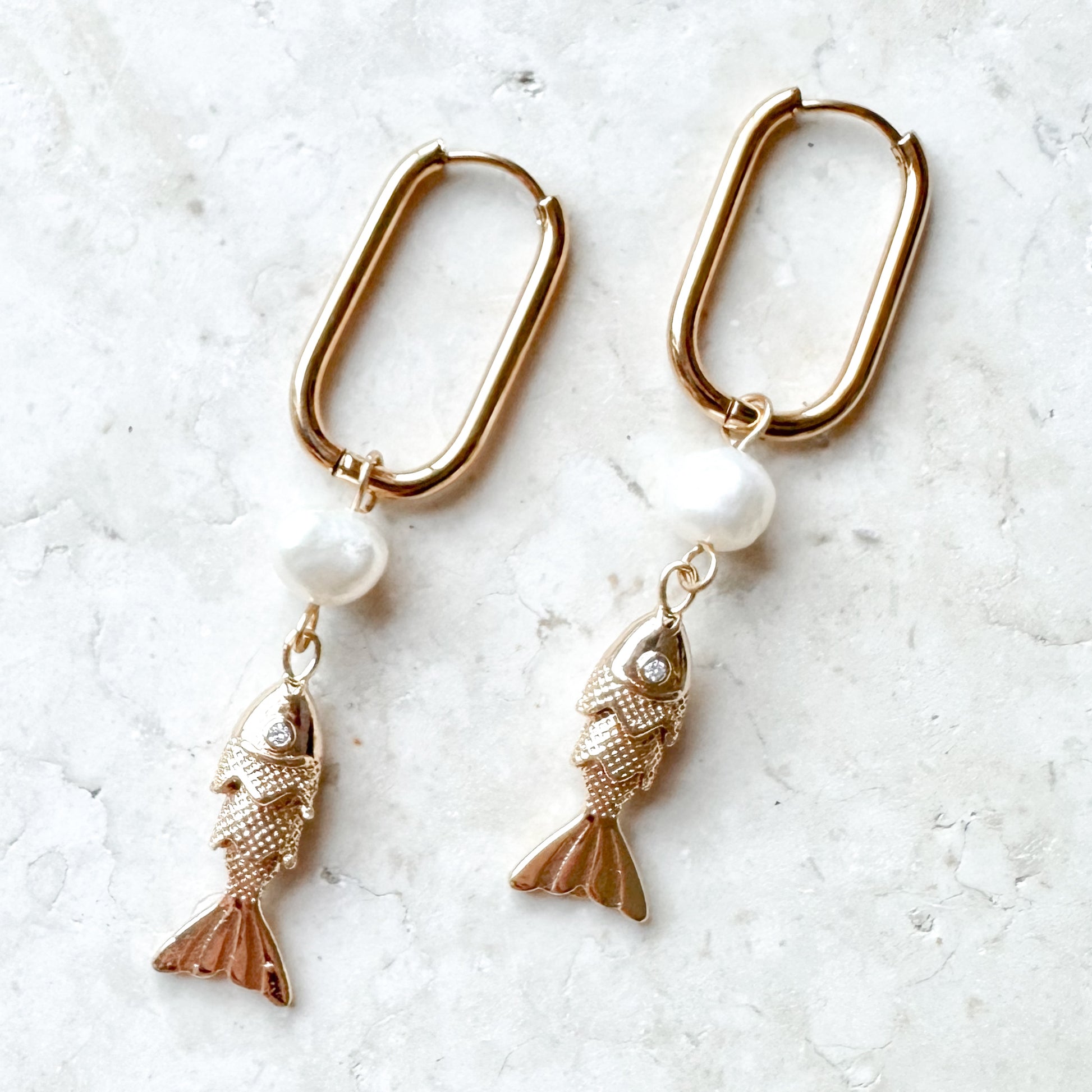 The Adriana Hoops bring a subtle Mediterranean charm to a classic hoop silhouette. A natural freshwater pearl is paired with a delicate gold fish charm, creating a design that feels both playful and refined.