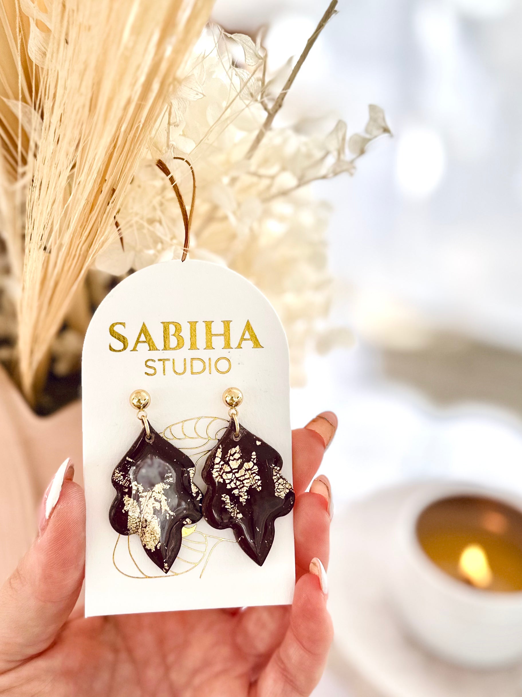 Deep chocolate brown coloured polymer clay earrings with interwoven gold leaf accents ✨
