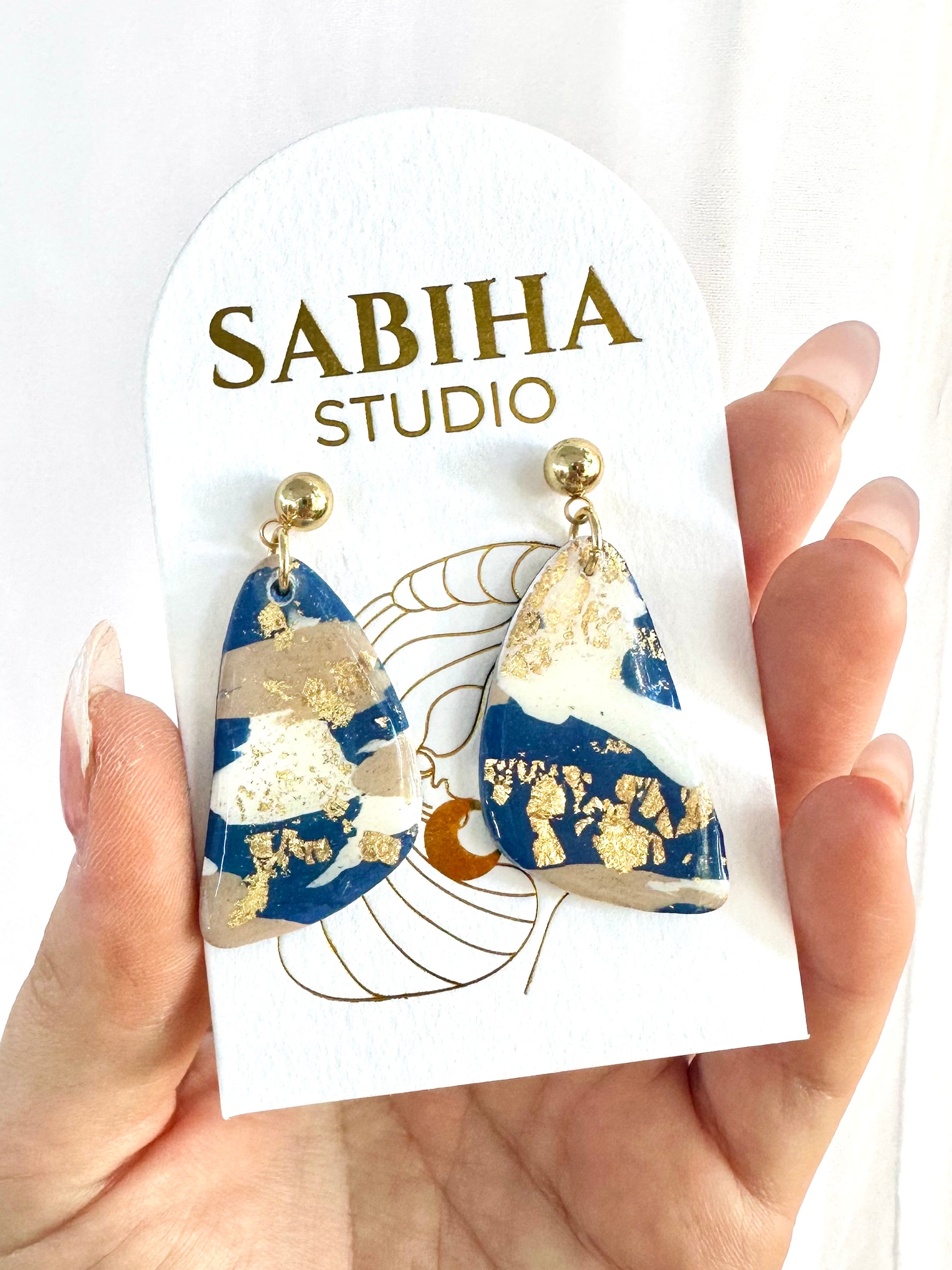 We love a versatile statement piece and Hot and Unbothered ticks all the boxes. Navy, tan and white polymer clay interwoven with gold flake accents ✨