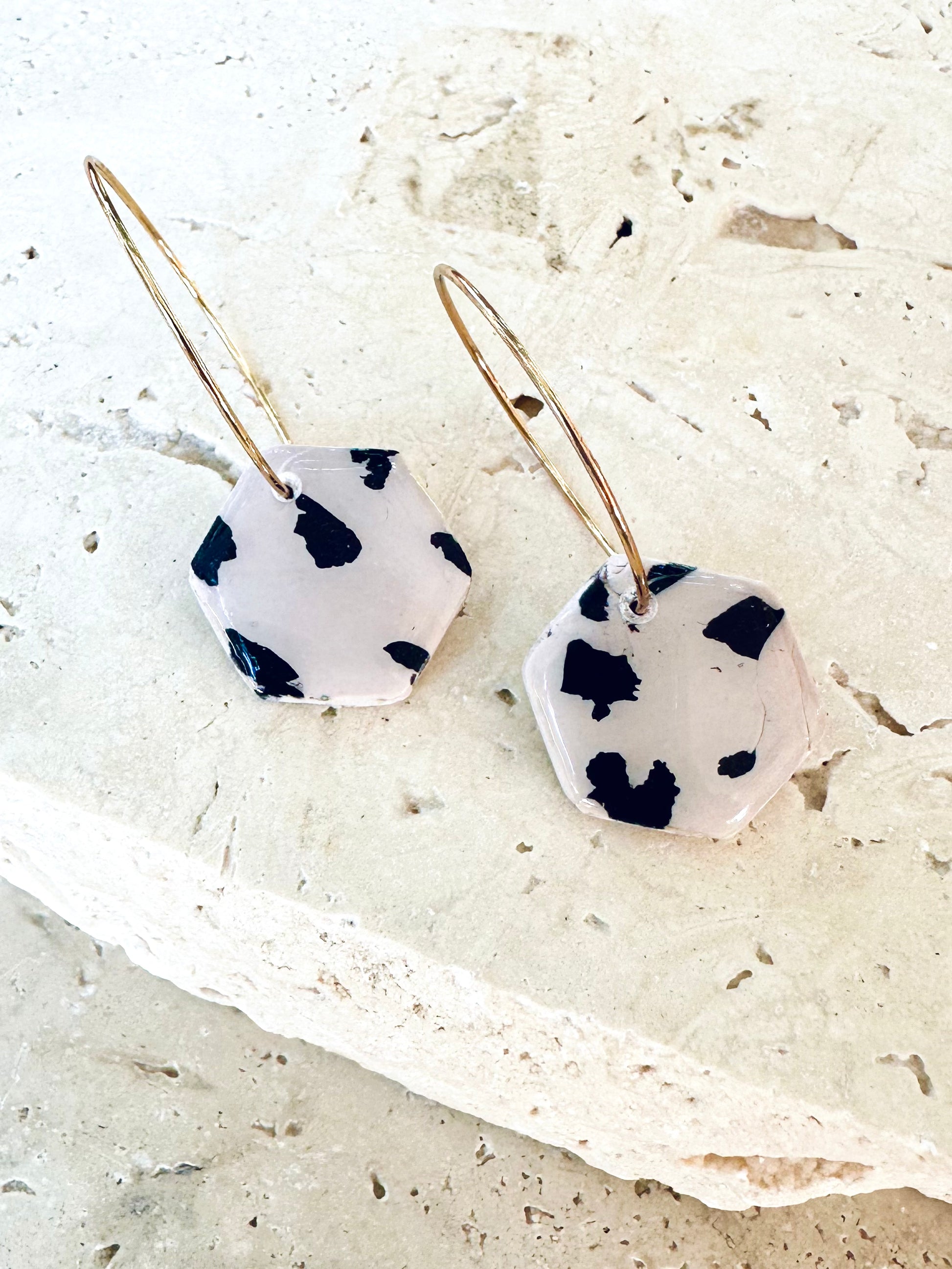 Flirty yet sweet leopard print hexagonal polymer clay hoops finished with a high shine resin