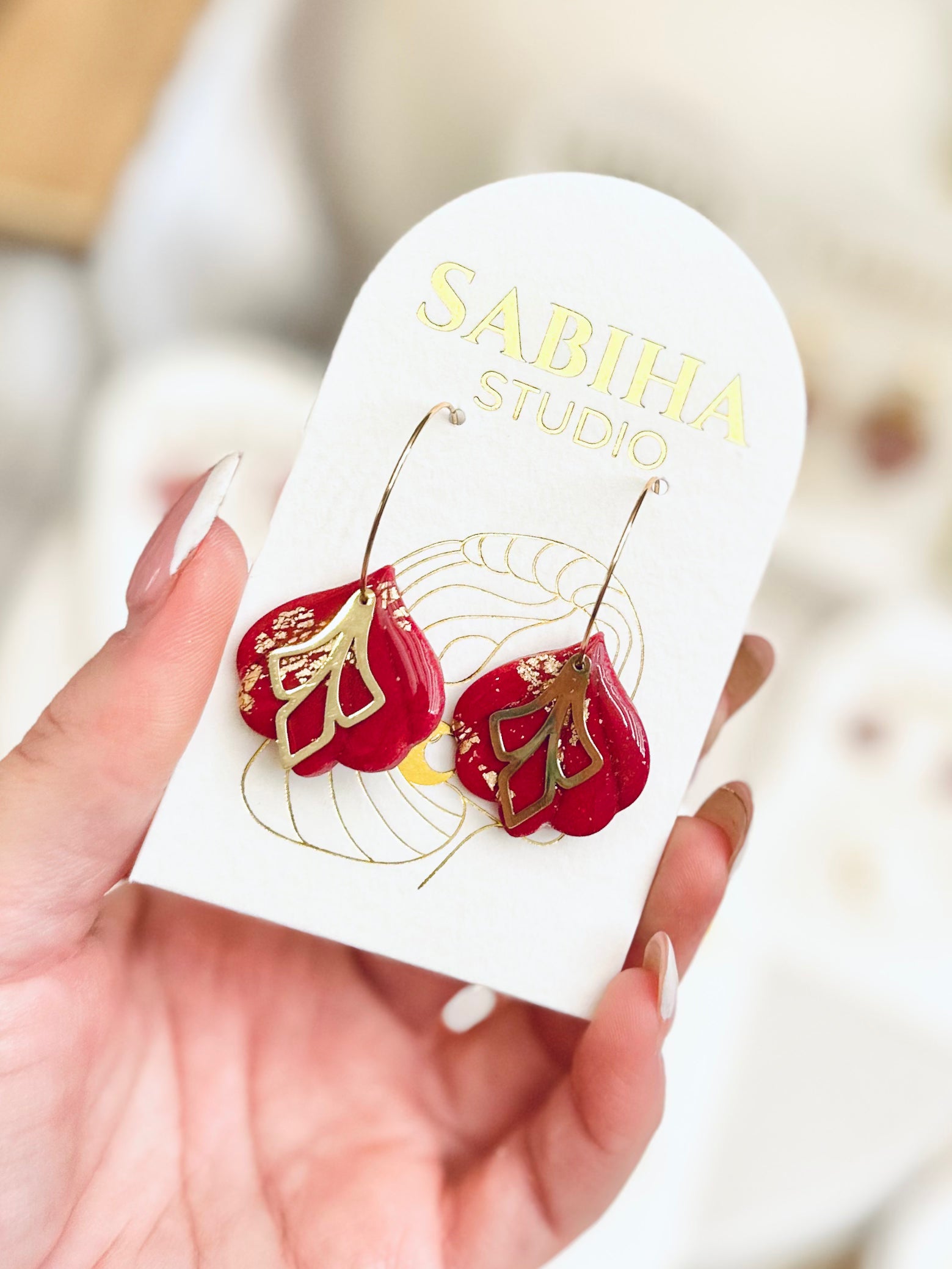 Beautiful warm deep crimson polymer clay earrings with gold flake inlay ✨