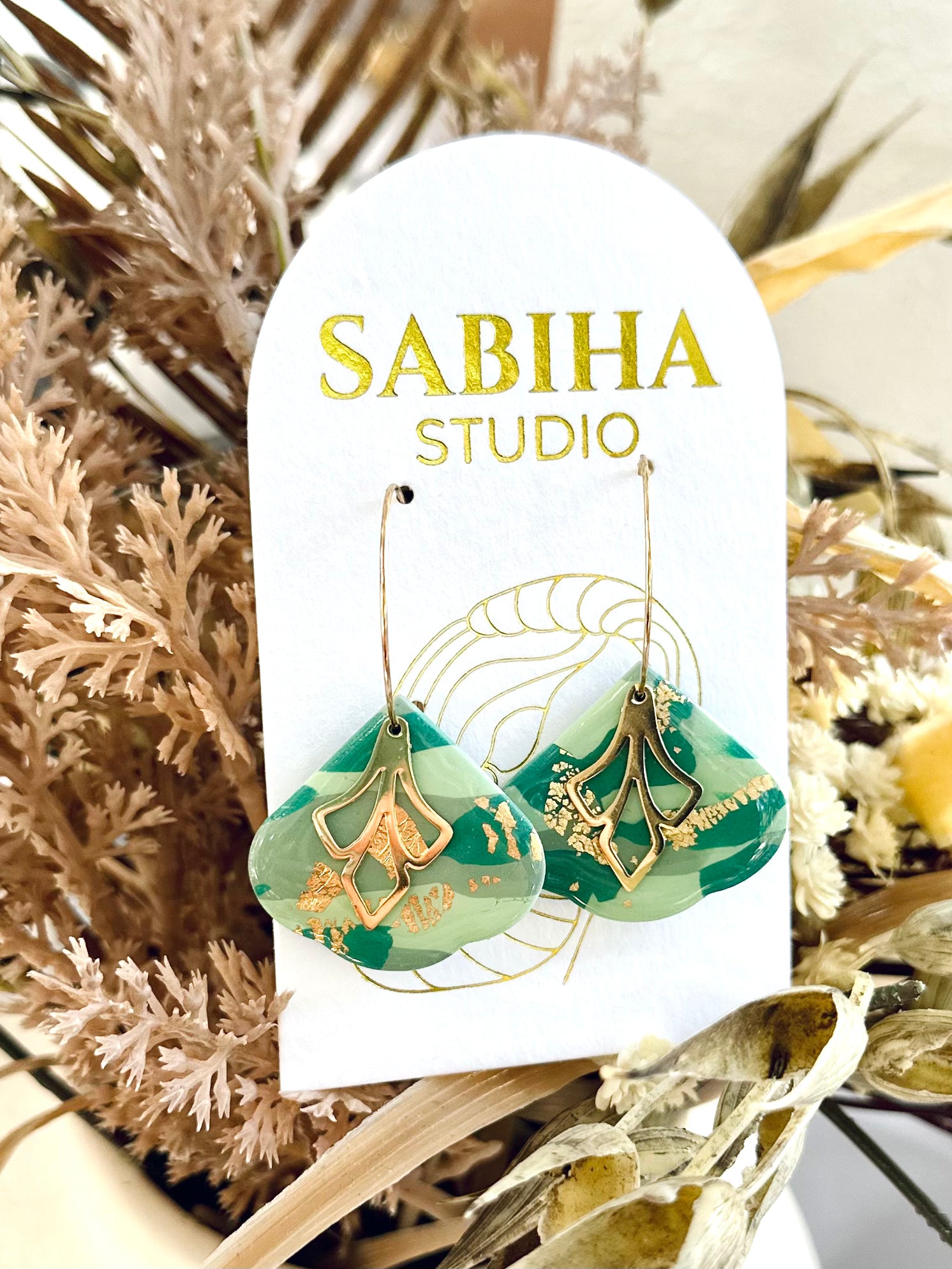 Beautiful blends of muted green, khaki and olive polymer clay earrings with gold flake detailing