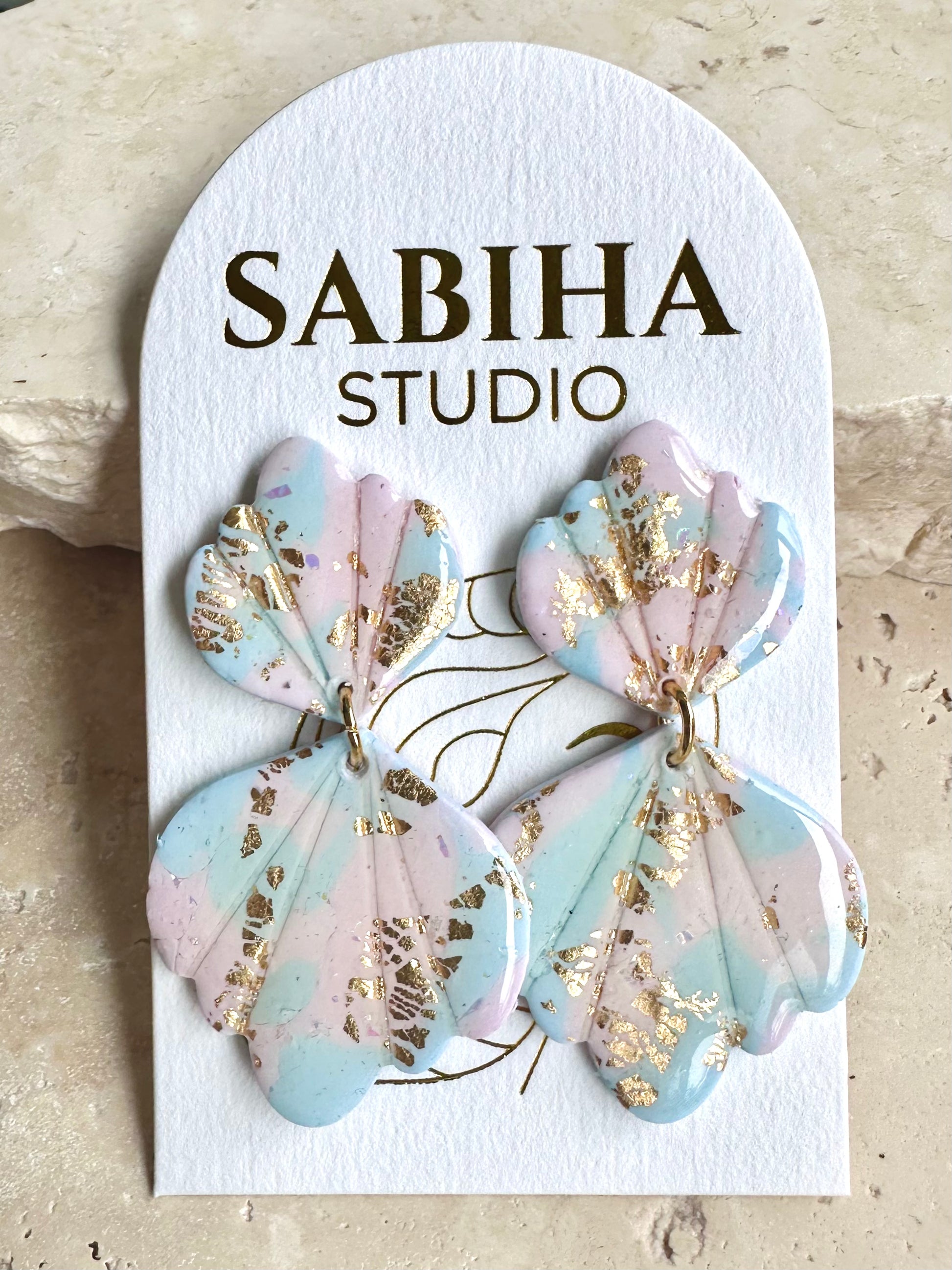 Meet Oceana. She’s a fun mermaid inspired, soft pink and blue polymer clay earring with a gold sparkle finish