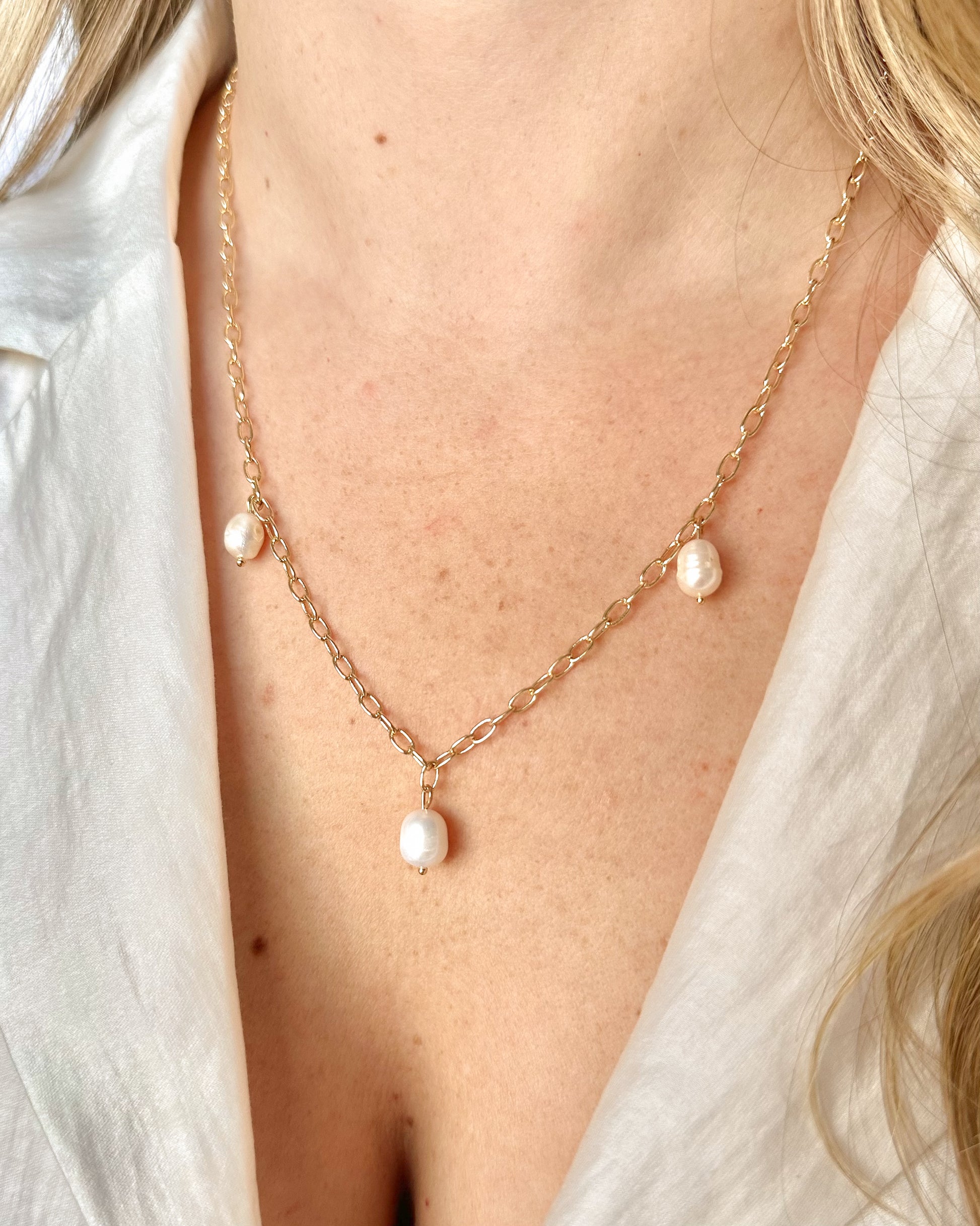 The Sorrento Necklace is a refined layering piece designed to add subtle texture and movement. Three natural pearls are spaced along a fine paperclip-style chain, creating a soft, luminous detail that catches the light beautifully.