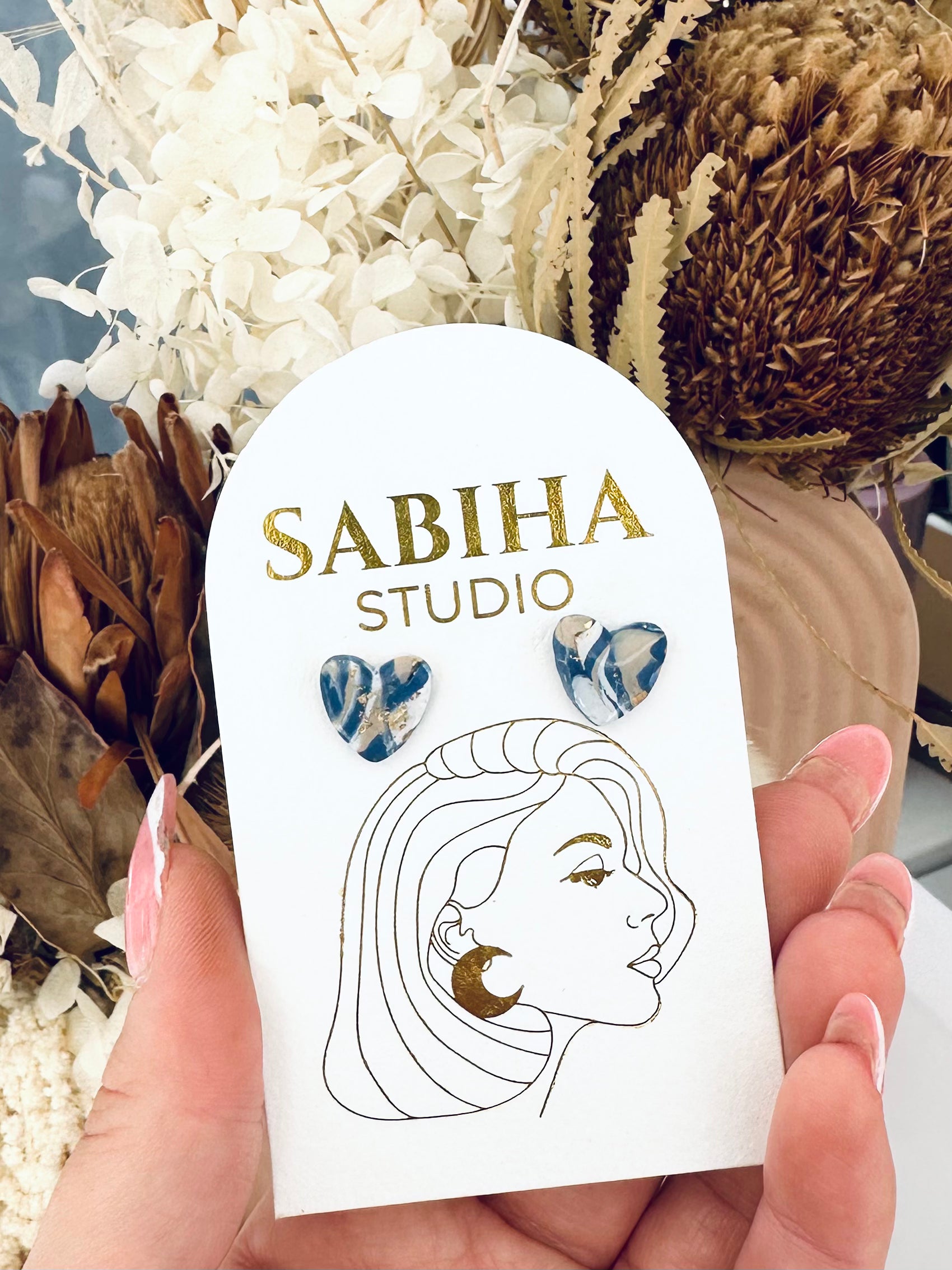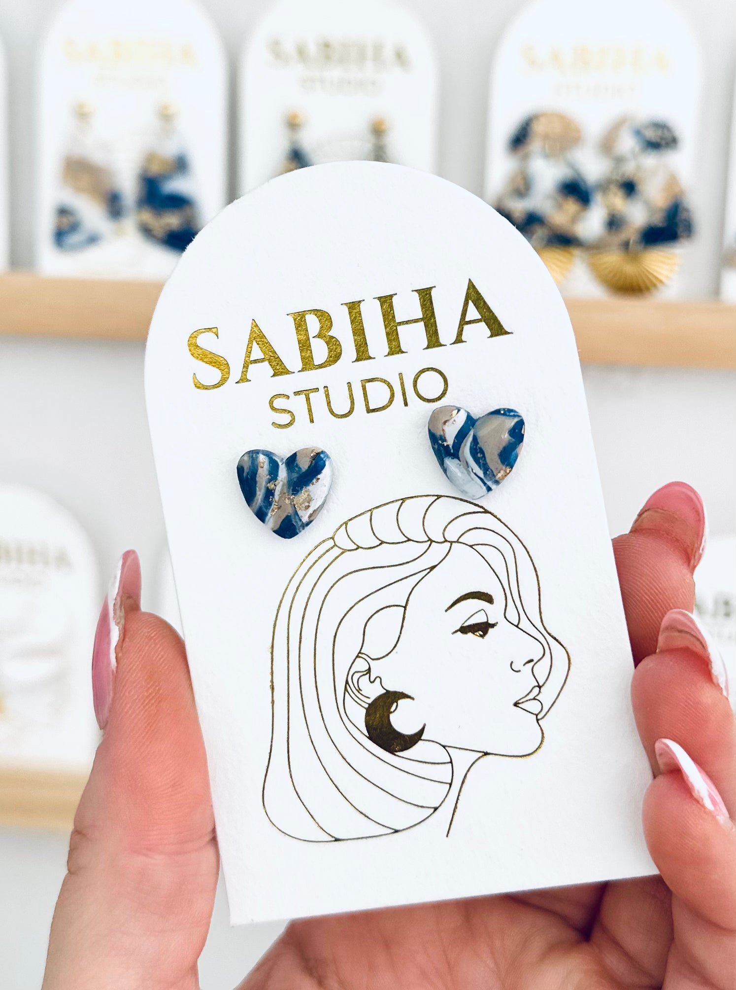 Hello Sweetheart! Perfect for a cute and casual vibe, second lobe piercings, and also for our gorgeous littlest customers. Rich navy, tan and white coloured polymer clay with gold flakes and a high shine finish